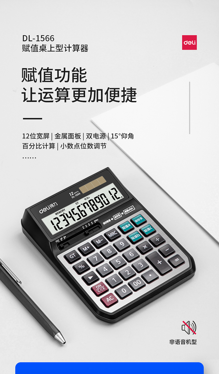 得力 deli 赋值功能桌面计算器 双电源供能 12位宽屏显示 带拨动开关 银色1566