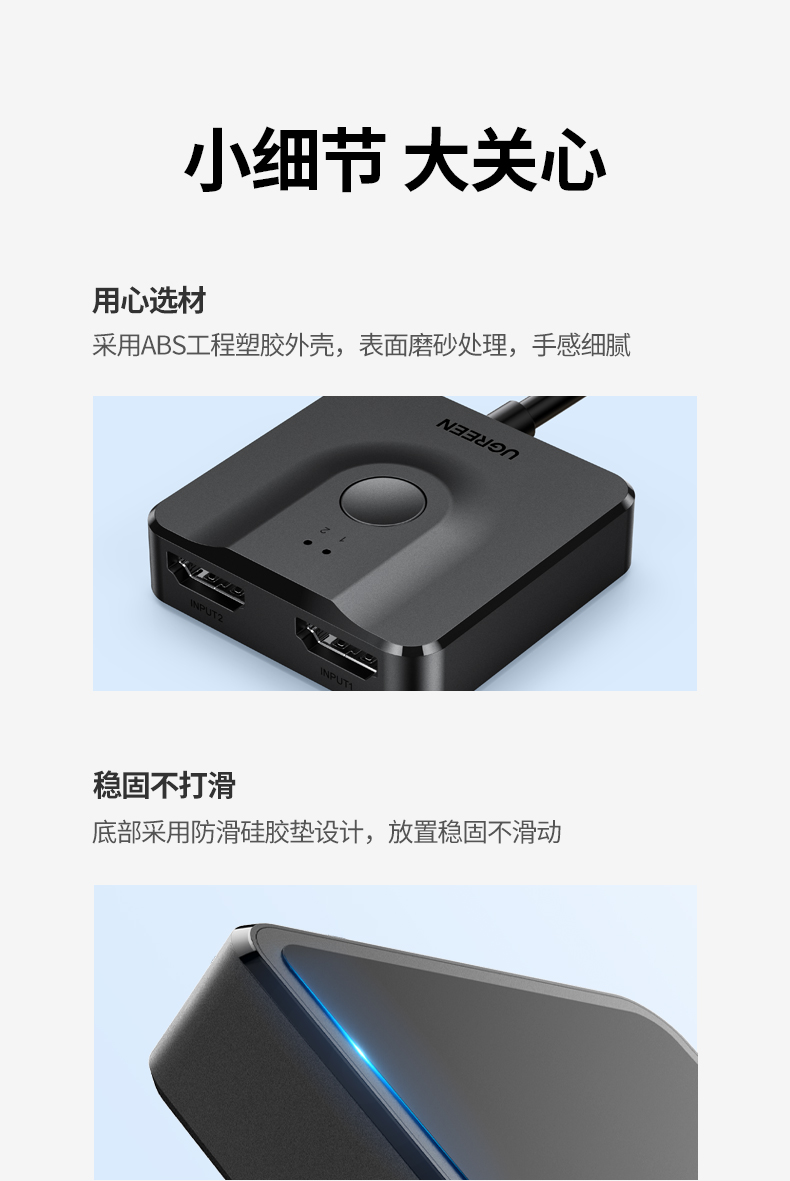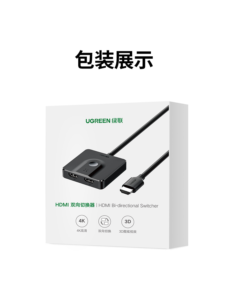 绿联/UGREEN CM311 数据线 HDMI切换器二进一出 4K高清视频分配器一分二 笔记本电脑智能盒子接电视投影仪屏幕双向切换 70607